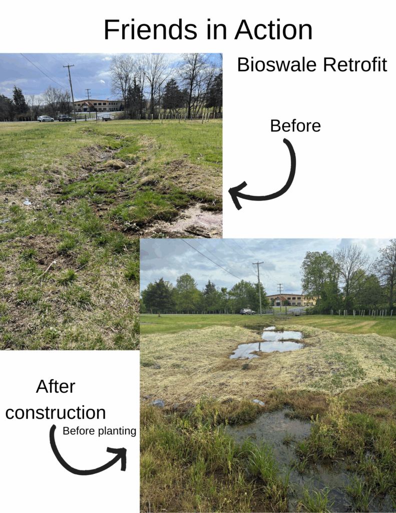 Funded by a 319 grant from the PA Department of Environmental Protection and US Environmental Protection Agency, TCCCA recently completed work on a bioswale retrofit in the Lynch Run watershed, a tributary of the Conewago. A stormwater swale on the Friends in Action property receives runoff from upstream properties and was suffering from erosion during storm events. The project restored the swale into a bioswale with a series of wetland pools to reduce erosion, improve water quality, and enhance habitat. TCCCA’s consultant, Spring Hill Partners, and contractor Commander Contracting completed work in May and TCCCA joined Penn State “Greening the Lower Susquehanna” volunteers to plant 450 wetland plant plugs on May 31. Native meadow seed was also established at the site to enhance onsite habitat. The project complements an existing forest riparian buffer restoration along the tributary of Lynch Run that flows through the property. Thanks to all involved, especially Friends in Action for their willingness to host this project!